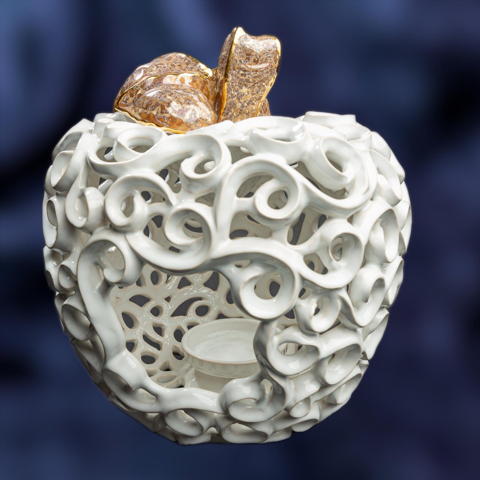 Apple-Shaped Candle Holder – White color with a golden leaf and a stalk