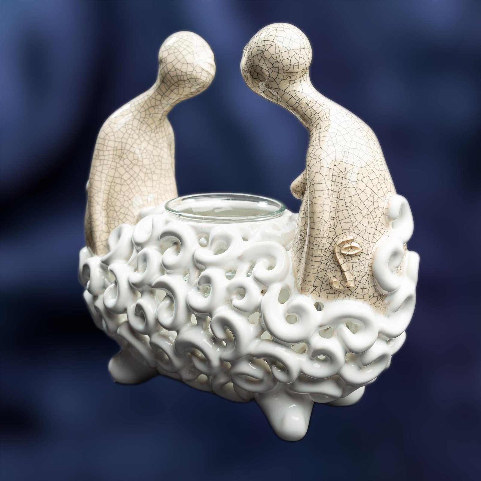 Togetherness Candle Holder—a captivating centerpiece that celebrates connection and warmth. This handcrafted design features a gracefully sculpted couple adorned with delicate crackle glaze, resting on an intricately hollowed ornamental base. When lit, the candlelight beautifully filters through the design, creating a serene and inviting ambiance. A perfect gift or a striking addition to your decor, this piece symbolizes love and unity. Each of our items is meticulously packed and insured for safe international shipping, arriving in a beautifully designed gift box. Please note each piece is unique, colors and shades may vary.